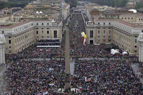 أضاف البابا فرنسيس يقول: ففي هذين الرجلين المتأملين بجراح يسوع والشاهدين لرحمته كان يقيم “رجاء حيّ” و “فرح لا يوصف ملؤه المجد” (1 بط 1، 3. 8). الرجاء والفرح اللذان يعطيهما المسيح القائم من الموت لتلاميذه واللذان لا يمكن لأحد ولا لأي شيء أن يحرمهم منهما. الرجاء والفرح الفصحيان اللذان مرّا عبر بوتقة التجرّد وإفراغ الذات والقرب من الخطأة حتى النهاية، حتى الغثيان بسبب مرارة تلك الكأس. هذان هما الفرح والرجاء اللذين نالهما هذان البابوان كعطية من الرب القائم من الموت واللذين بدورهما منحاهما بغزارة لشعب الله ونالا عنهما إقرارًا أبديًّا.