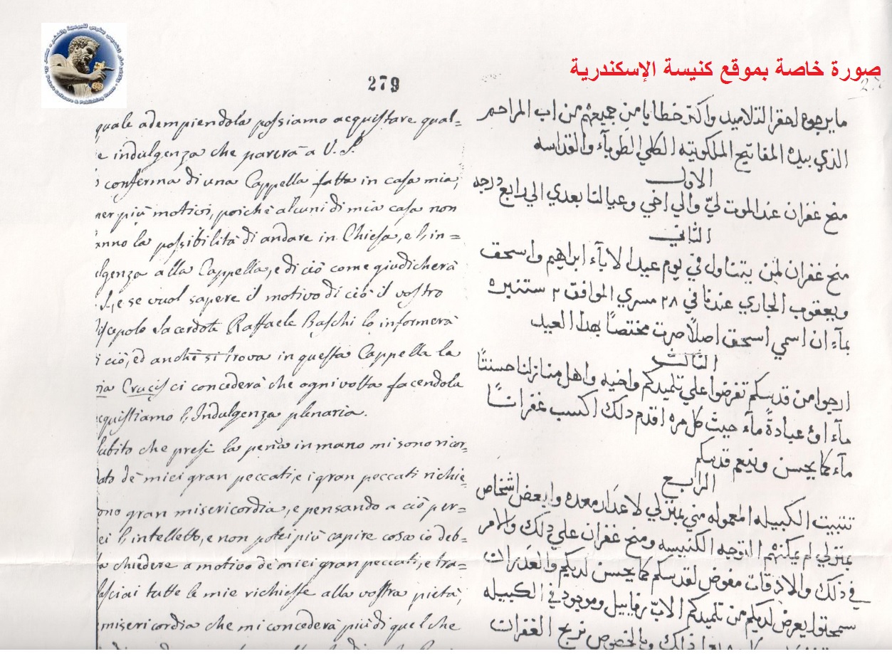 لديكم والعذر ان سمحتوا يعرض لديكم من تلميدكم الاب رفاييل وموجود في الكبيله دورة الصليب كل مره يعمل ذلك وبالخصوص نربح الغفران فحين مسكت القلم افتكرت كترت خطاياي والكتير يحتاج الي رحمه كتير فمن ذلك غاب عقلي ولم صرت افهم اطلب شيًا لتقل خطاياي فتركت كل طلبتي الي حنؤ رحمتك ومآء تمنحوه يفوق عن مطلوبي ولم ليّ سوي يا رب غير مستحق بل قول كلمه فابري بكليتي» وترجمة النص المرسل باللغة الايطالية إلى اللغة العربية :