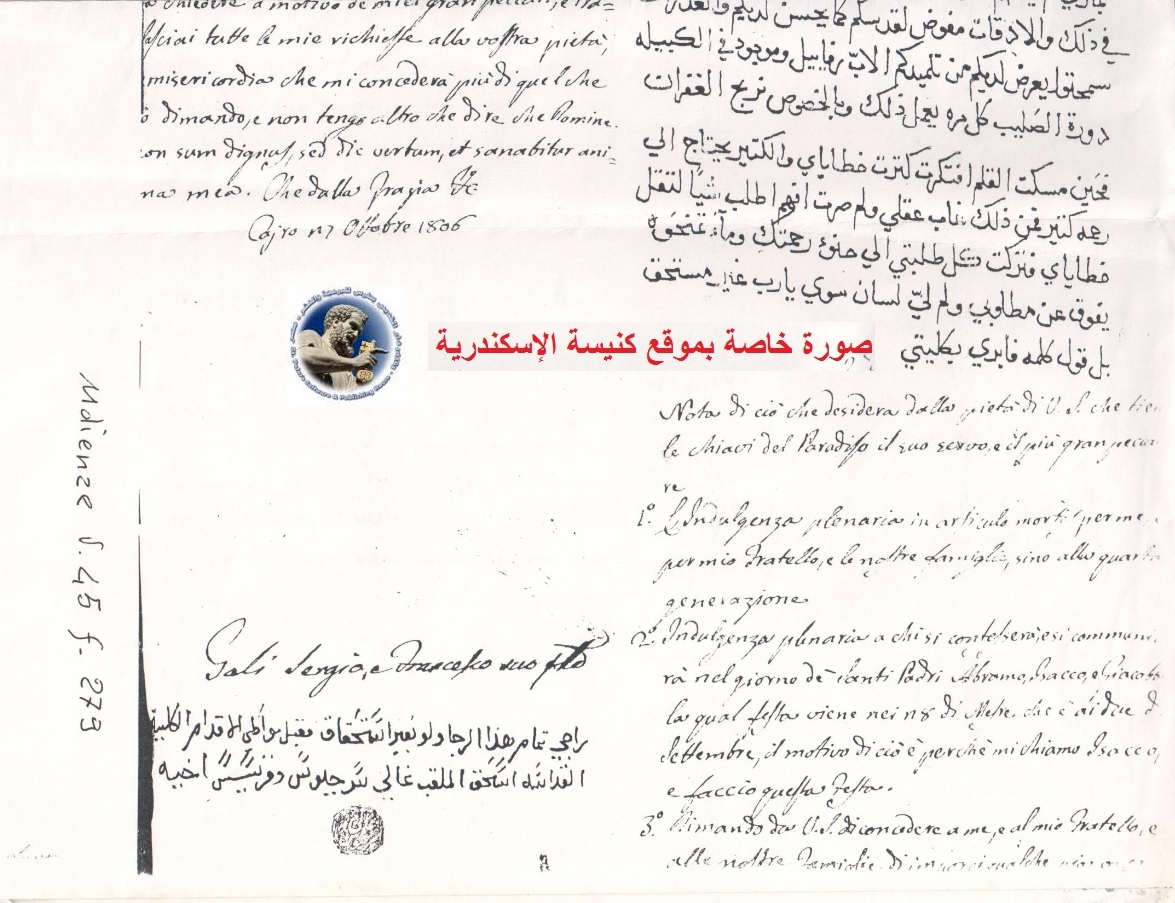 «ملاحظة في ما يرغب من تقوى قداستكم، الذي بيده مفاتيح الجنة، عبده أكبر الخاطئين: الغفران الكامل عند الوفاة، لي ولأخي وعائلتينا حتى الجيل الرابع. الغفران الكامل لمن يعترف ويتناول يوم الآباء القديسين إبراهيم واسحق ويعقوب، علما بأن العيد الأخير يقع في 28مسري، أيّ في 2سبتمبر، وبسبب ذلك أنّي أدعي اسحق وأحتفل بهذا العيد. ألتمس من قداستكم أن تمنحني، أنا وأخي وعائلتينا، عملاً صالحاً نستطيع، بفضل القيام به، أنّ نربح الغفران الذي تحدّده قداستكم. تثبيت معبد قائم في منزلي لعدّة أسباب، فإنّ كثيرين منّا لا يستطيعون الذهاب إلي الكنيسة، وغفراناً للمعبد، كما تراه قداستكم. وإنّ أردتم أن تعرفوا سبب ذلك، فإن تلميذكم الكاهن روفائيل بسكي يطلعكم عليه. وفي معبدنا درب الصليب، يمنح، كلّ مرة نقوم به، غفراناً كاملاً. ما إنّ تناولت القلم ختى ذكرت خطاياي الكبيرة، ولكن الخطايا الكبيرة تتطلب رحمة عظيمة، وفيما أنا أفكر في ذلك، فقدت صوابي ولم أعد أعرف ماذا عليّ أنّ أطلبه بسبب خطاياي الكبيرة، وأسلمت جميع مطالبي إلى تقواكم. هذا وإنّ رحمتكم ستمنحني أكثر مما أطلبه، ولا أستطيع إلا أن أقول: ربّي، لست مستحقًا، ولكن قل كلمة واحدة فتشفي نفسي. وهذا ما أنتظره من نعمتكم» تحريرًا في القاهرة في يوم 27 أكتوبر 1806، غالي سرجيوس وأخوه فرنسيس.