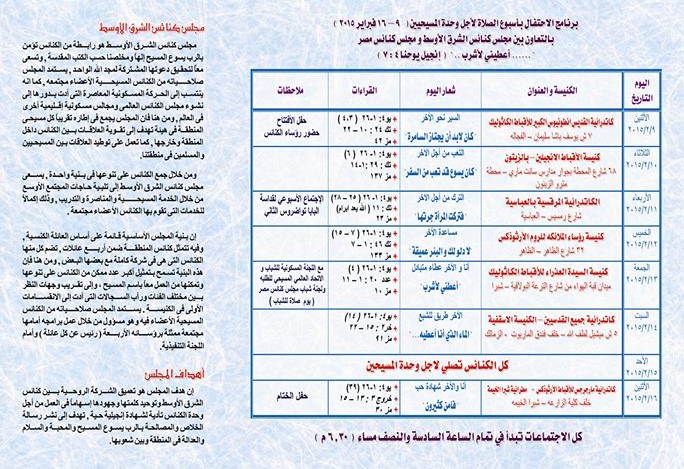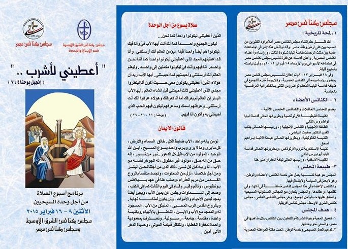 تنطلق بمشيئة الله و بصلوات رؤساء العائلات المسيحية في مصر،غدا الاثنين 9 فبراير الجاري فعاليات أسبوع الصلاة لأجل وحدة المسيحيين حول شعار ” أعطني لأشرب ” المأخوذ من انجيل ربنا يسوع المسيح حسب ما دونه البشير يوحنا الفصل ال 4 و العدد ال 7 ” حوار الرب يسوع مع المرأة السامرية عند بئر معلمنا يعقوب “، و تمتد حتى يوم الاثنين 16 فبراير 2015 ، و أعدت له ” لجنة الاعداد للاحتفال بأسبوع الصلاة ” بمجلس كنائس الشرق الأوسط وبالتعاون مع مجلس كنائس مصر .